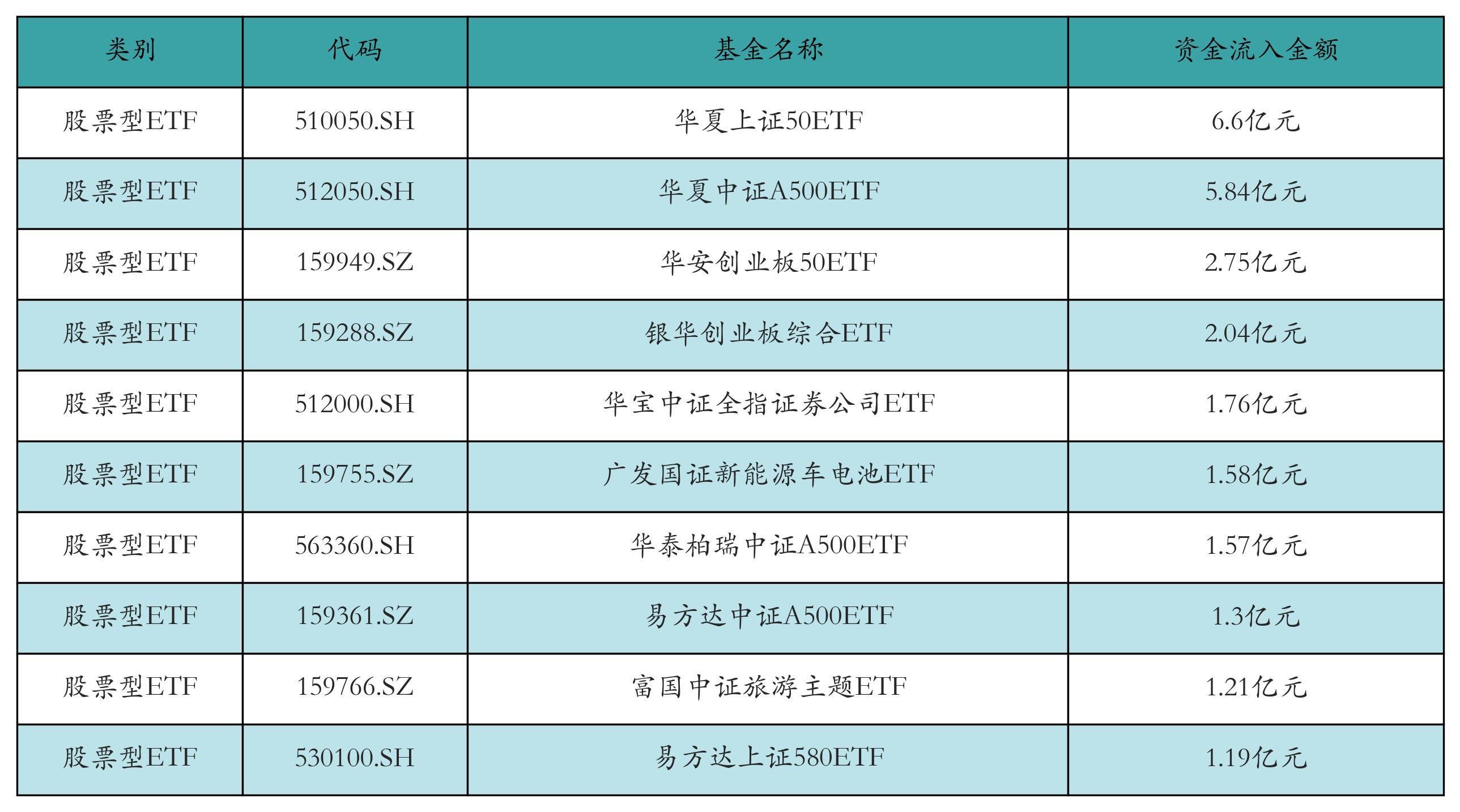 昨日股票型ETF资金流入最多的3只ETF及其流入金额分别为:华夏上证50ETF(流入6.6亿元)、华夏中证A500ETF(流入5.84亿元)、华安创业板50ETF(流入2.75亿元)。资金流入前10详情见下表: