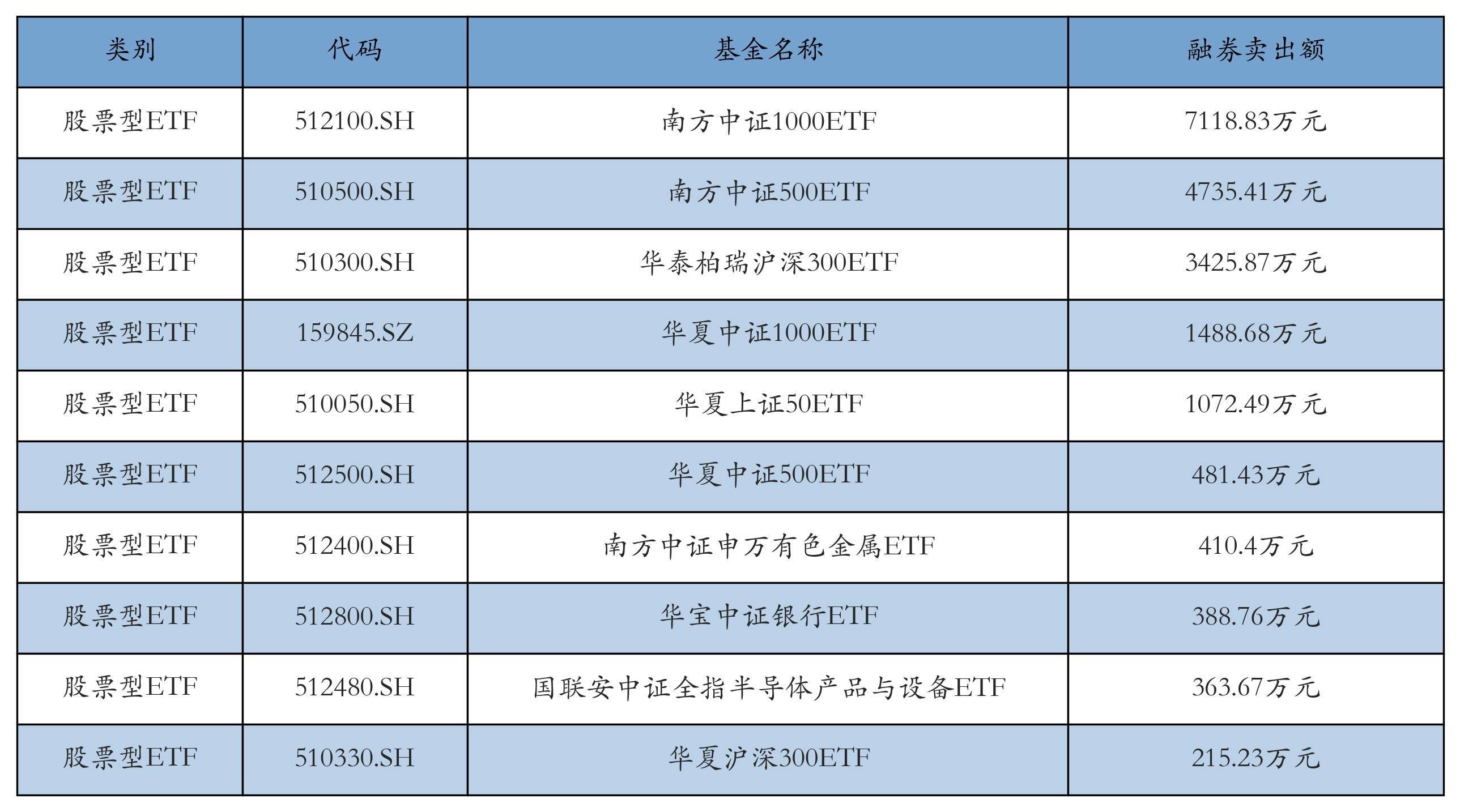 昨日股票型ETF融资卖出额最高的3只ETF及其卖出金额分别为:南方中证1000ETF(7118.83万元)、南方中证500ETF(4735.41万元)、华泰柏瑞沪深300ETF(3425.87万元)。融券卖出额前10详情见下表: