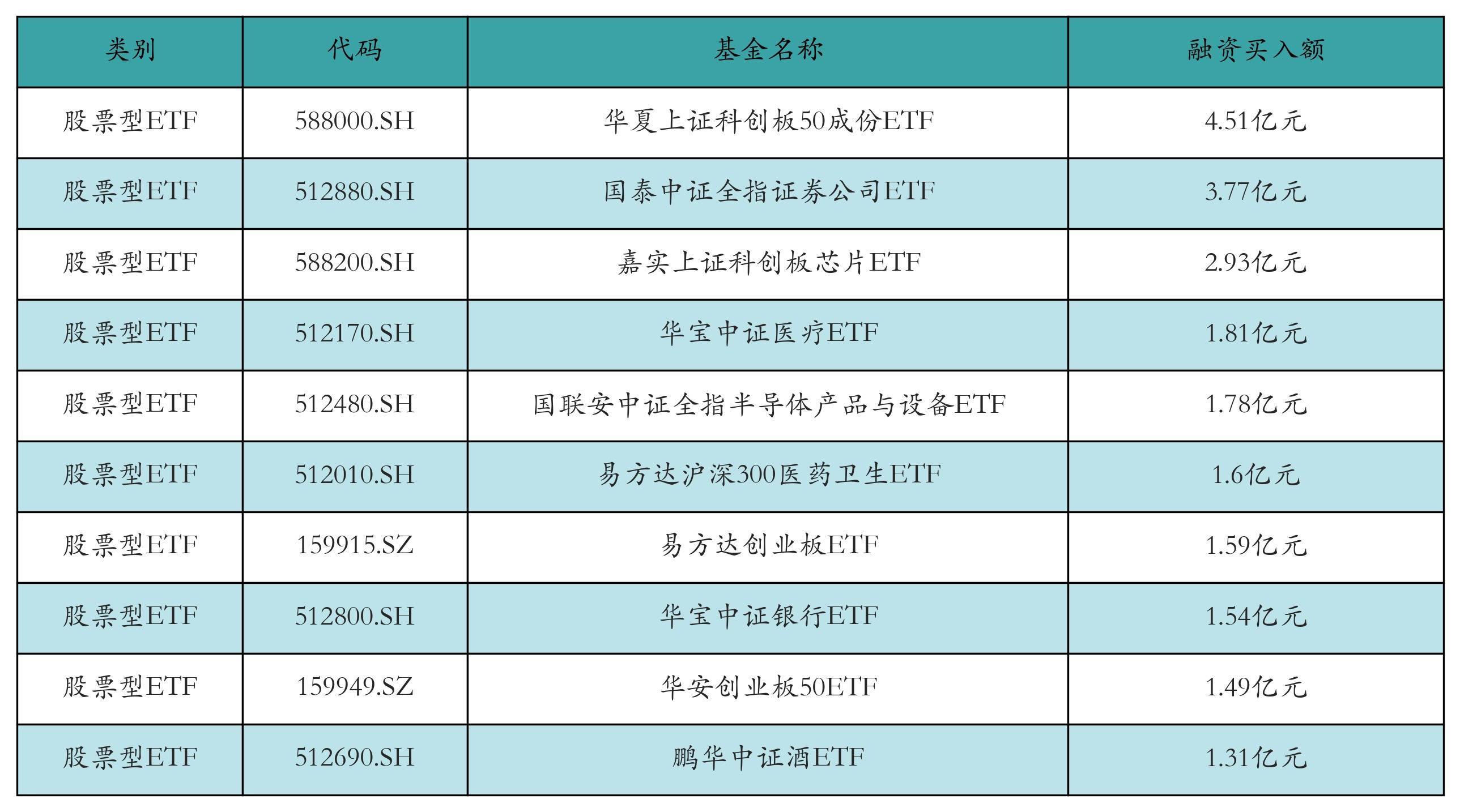 昨日股票型ETF融资买入额最高的3只ETF及其买入金额分别为:华夏上证科创板50成份ETF(4.51亿元)、国泰中证全指证券公司ETF(3.77亿元)、嘉实上证科创板芯片ETF(2.93亿元)。融资买入额前10详情见下表: