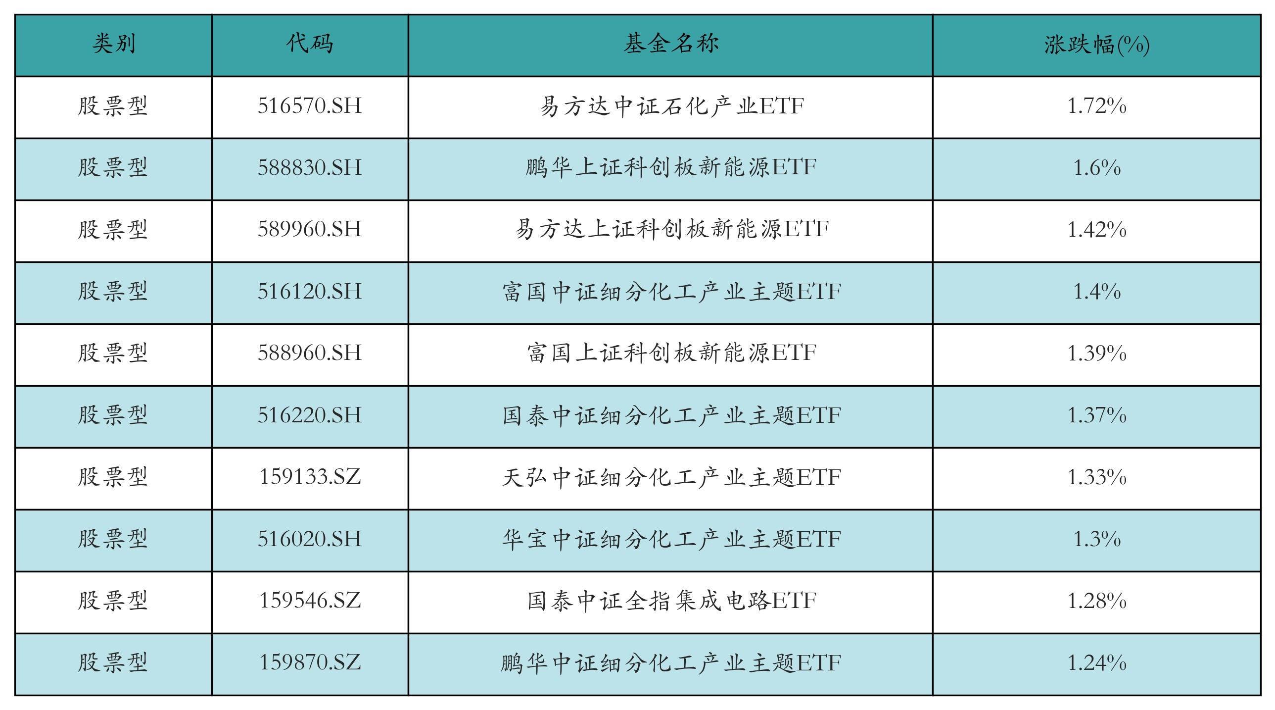 昨日股票型ETF涨幅最高的3只ETF及其收益率分别为:易方达中证石化产业ETF(1.72%)、鹏华上证科创板新能源ETF(1.6%)、易方达上证科创板新能源ETF(1.42%)。涨幅前10详情见下表: