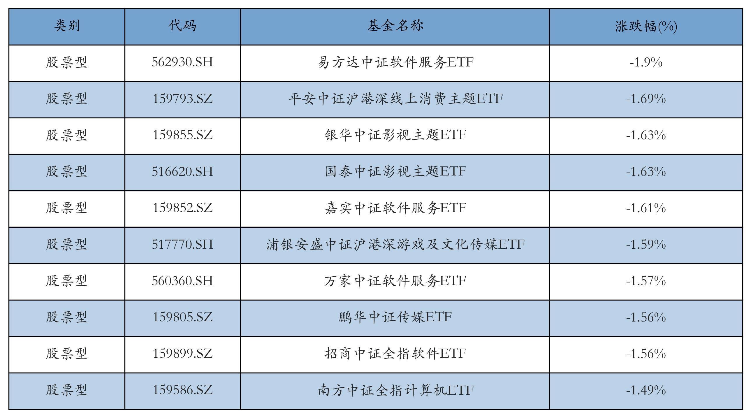 昨日股票型ETF跌幅最大的3只ETF及其收益率分别为:易方达中证软件服务ETF(-1.9%)、平安中证沪港深线上消费主题ETF(-1.69%)、银华中证影视主题ETF(-1.63%)。跌幅前10详情见下表: