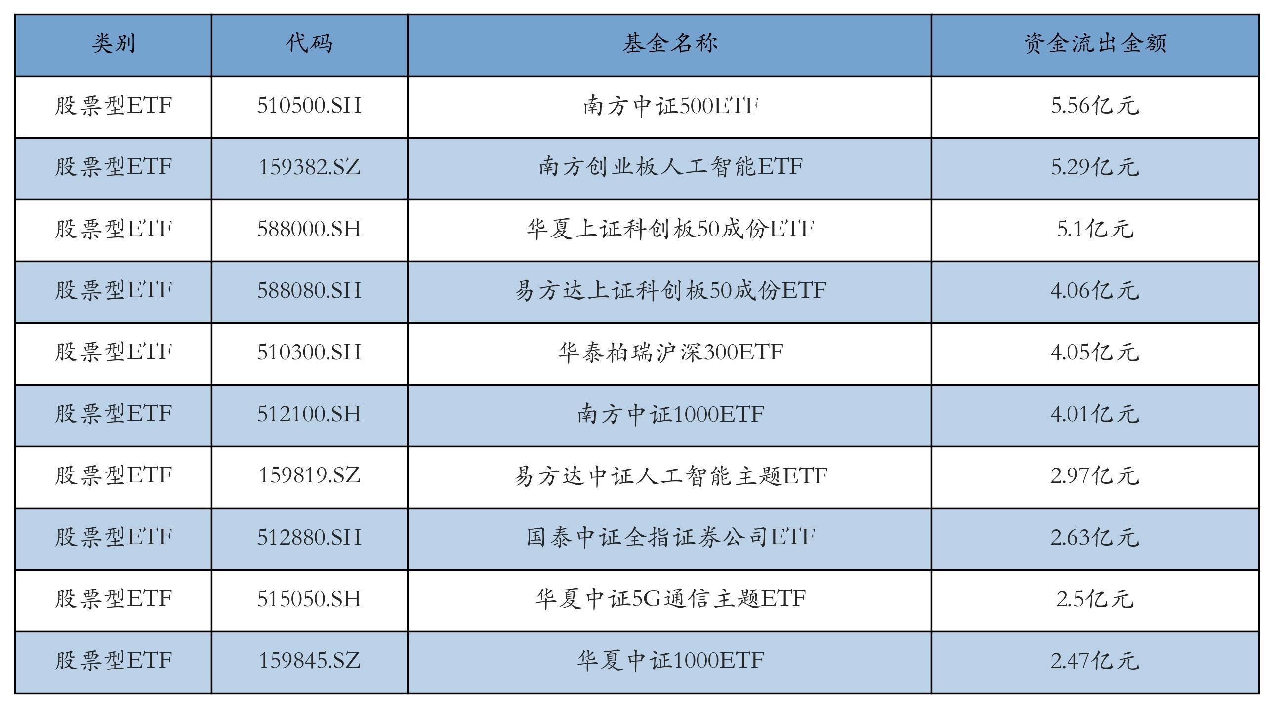 昨日股票型ETF资金流出最多的3只ETF及其流出金额分别为:南方中证500ETF(流出5.56亿元)、南方创业板人工智能ETF(流出5.29亿元)、华夏上证科创板50成份ETF(流出5.1亿元)。资金流出前10详情见下表: